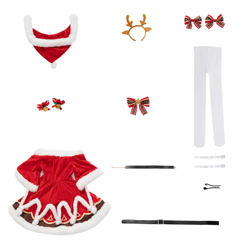 - Package: Hat*1, Dress*1, Antler Headdress*1, Hair Ornament Bow*2, Chest Bow*1, Bell Accessories*2, Belt*1, Collar Accessories*1, Pantyhose*1, Transparent Shoulder Strap*2, Hair Clip*2